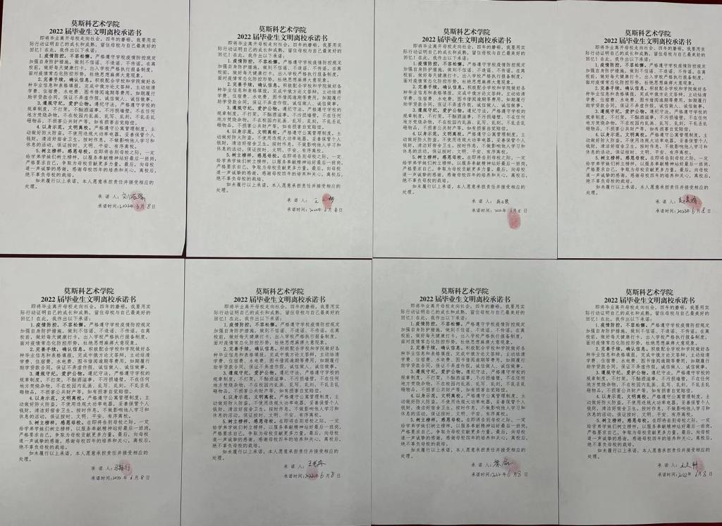 最后,辅导员将《莫斯科艺术学院2022届毕业生文明离校承诺书》内容给大家宣讲,提醒大家疫情防控,不容松懈;完善手续,确认信息;遵规守纪,爱护公物;以身示范,文明离校;树立榜样,感恩母校。每位毕业生神情专注,一丝不苟地在承诺书上签下对母校的郑重承诺。