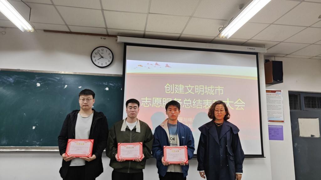辅导员张静雯宣读了《物理与电气工程学院关于表彰创建文明城市志愿服务先进个人、优秀志愿者的决定》,对获奖同学表示衷心的祝贺。学院领导和辅导员依次为先进个人、优秀志愿者同学颁发了证书。