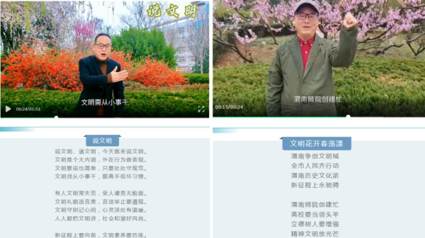 学校文明创建工作办公室印制《创建全国文明城市师生应知应会应做》宣传资料,并推送《你文明的样子,就是城市文明的样子!》《文明你我他 创建靠大家》《我为文明渭南代言》等宣传内容,组织广大师生学习践行,引导全体师生共同参与全国文明城市创建,让文明之光照亮校园,文明风尚浸润人心。学生工作部、团委、各学院以班级为单位先后组织开展文明创建主题班会、学雷锋主题故事分享会、学雷锋事迹诵读、学雷锋、助创文、环保绿植兑换等活动。经济与管理学院“书记小喇叭”栏目推出原创作品《说文明》《文明花开春荡漾》,号召广大师生提高个人文明素养,争做文明创建的践行者。