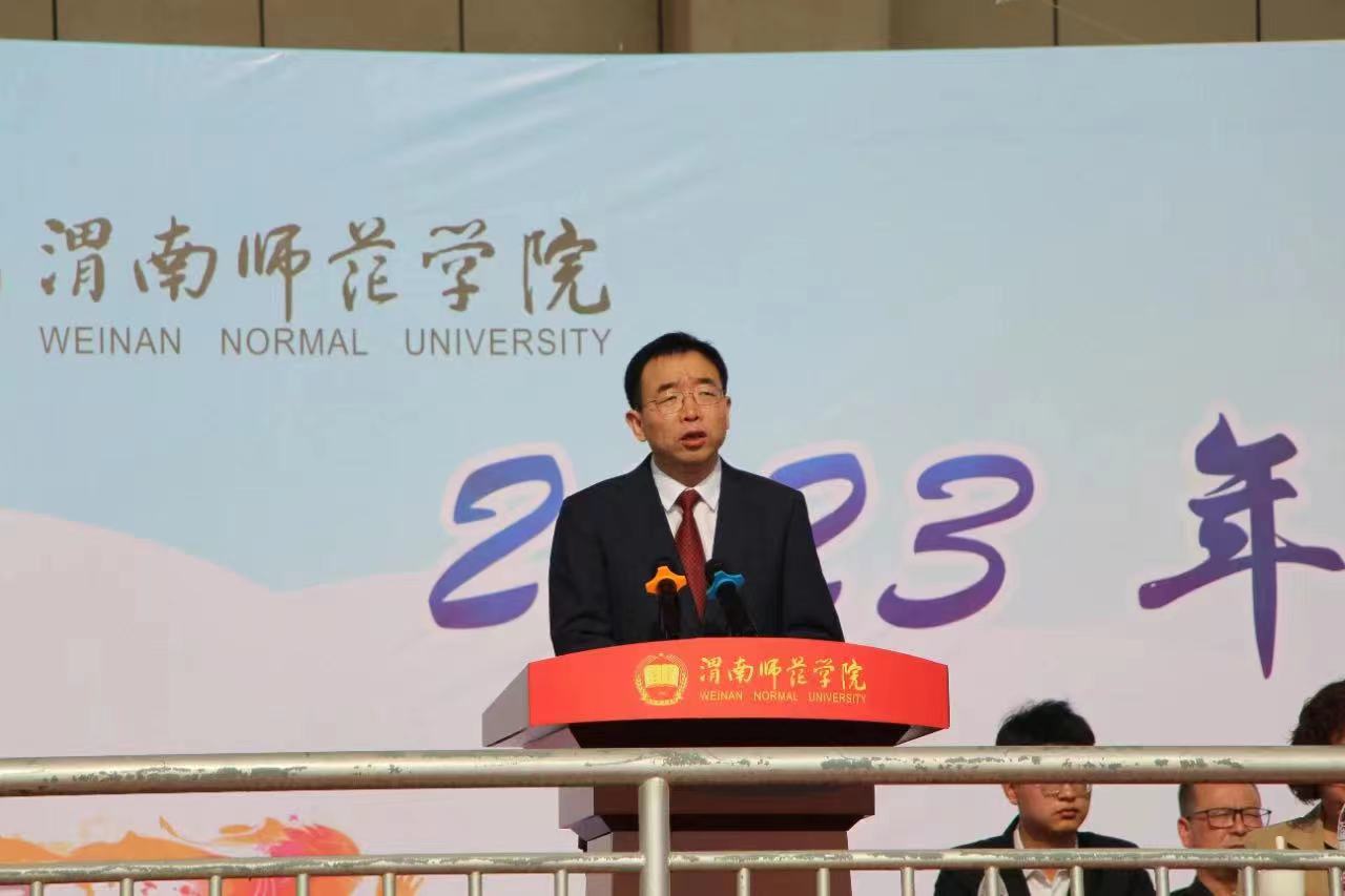 校长张守华致开幕词,他指出,培养德智体美劳全面发展的社会主义建设者和接班人,是国家教育方针,是新时代的要求。学校举办体育文化节暨春季田径运动会是贯彻党的二十大精神、学习贯彻习近平新时代中国特色社会主义思想主题教育、贯彻落实全国教育大会精神的重要举措。他讲到,2022年以来,学校坚持以习近平新时代中国特色社会主义思想为指导,深入学习贯彻党的二十大精神,坚持社会主义办学方向,坚持立德树人根本任务,聚焦主责主业,固根基,扬优势,团结带领全体师生知重负重,攻坚克难,学校事业取得新进展、新突破、新成绩。学校高度重视体育工作,大力改善体育运动条件,聚焦“教会、勤练、常赛”,体育选项课改革不断深化,大学生运动队训练不断加强,教职工体育文化活动丰富多彩,阳光体育运动蓬勃开展,师生在各类体育赛事中的良好表现和喜人成绩,充分展示了“渭师人”的精神风貌和竞技水平。他强调,田径运动会既是对我们体育素质、教育教学水平的一次综合检阅,更是激发全体师生热情与干劲,凝聚发展合力,增添发展动力的良好契机。他希望师生以“更高、更快、更强”的体育精神为指引,秉承“卓越、友谊、互敬”的奥林匹克理念,在体育运动中展示激情,彰显活力,感受体育精神带来的震撼和体育运动带来的快乐,大展“文明、团结、进取、超越”的“渭师”风采!