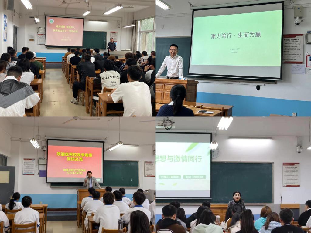 其他校友分别在各二级学院给师生作了《新高考模式下中学化学教师素质之我见》《学习改变命运 执着成就梦想》《聚力笃行,生而为赢》《脚踏实地,行稳致远,进而有为》《一路泥泞一路辙一路繁花一路歌---教师专业成长感悟分享》《天空没有留下鸟的翅膀,但我已飞过》《思想与激情同行》等主题报告,分享求学经历、成长故事、成功经验、人生感悟,讲述个人奋斗史,传播渭师好声音,激发渭师新动力。校友们的报告内容精彩纷呈,为师范生们上了一堂成长、成人、成才、奋斗的“思政大课”。(通讯员 东梅 王佩雯 审核人 孙宏恩 张勤恳 景根杰)