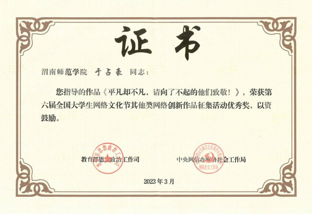 近日,在教育部思想政治工作司、中央网信办网络社会工作局联合主办的第六届全国大学生网络文化节活动中,伟德官网官微推文参选作品《平凡却不凡,请向他们致敬》荣获“其他类网络创新作品”优秀奖,这是伟德官网两次参加全国大学生网络文化节活动以来,首次荣获该类奖项。