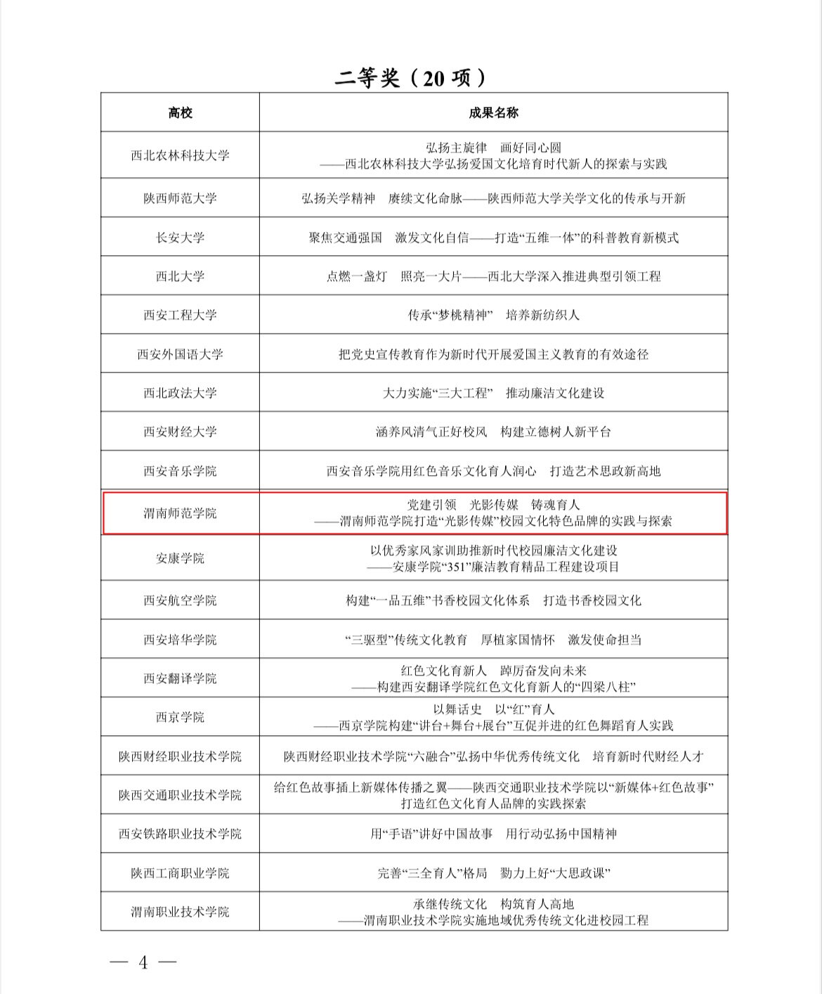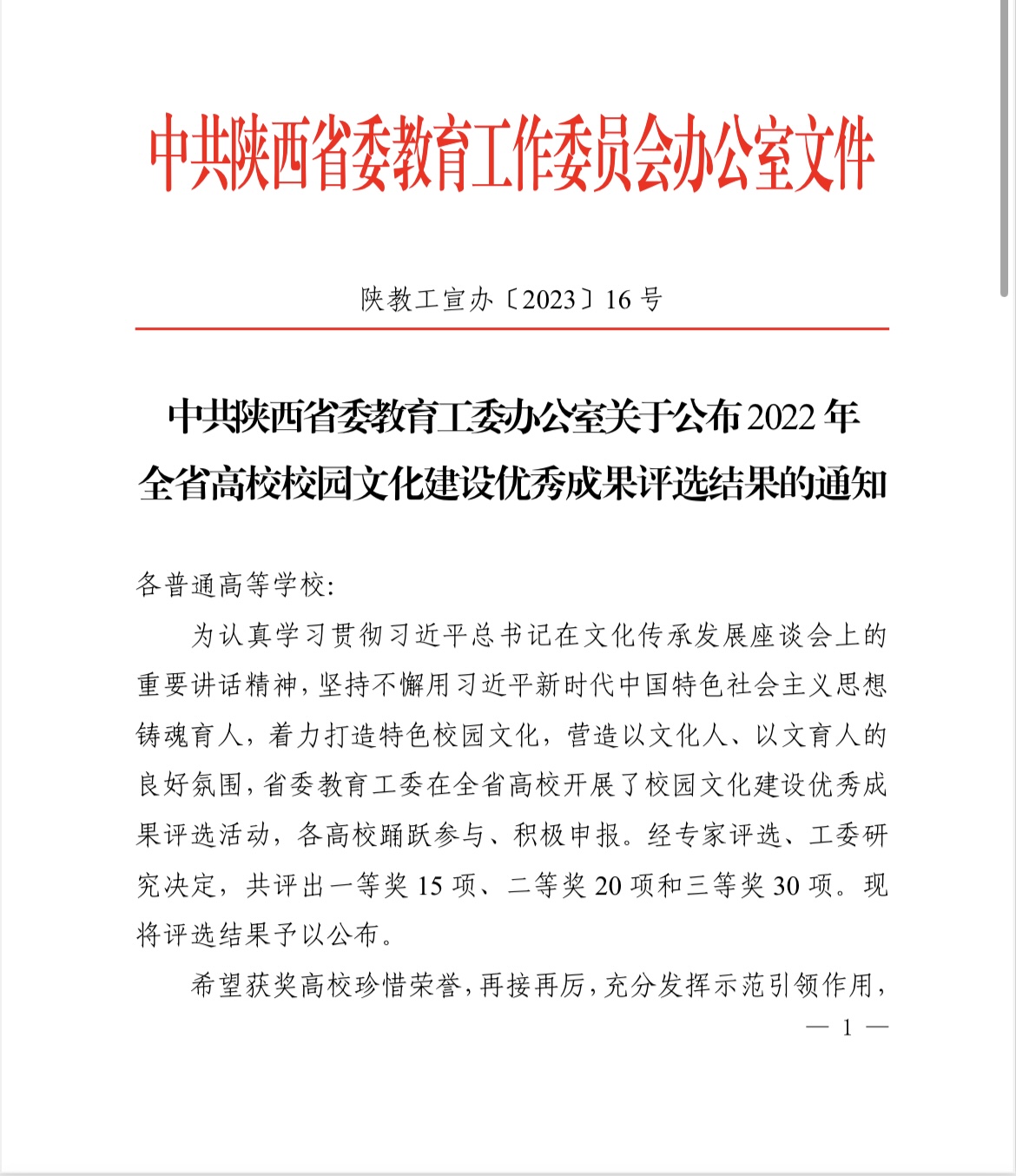 近日,中共陕西省委教育工委发文通报表彰2022年全省高校校园文化建设优秀成果奖,经学校宣传部评选推荐、传媒学院申报的《党建引领 光影传媒 铸魂育人——伟德国际1949官网打造“光影传媒”校园文化特色品牌的实践与探索》成果荣获二等奖。