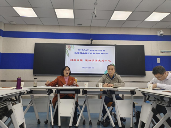 11月2日下午,教育科学学院召开以“创新发展、坚持以学生为中心”为主题的教师专题研讨会。校级教学督导付俊贤教授、赵兴牛教授,院级教学督导严苏凤副教授、张西宁副教授,学院教学副院长杨方琦、教学委员会委员、教学督导委员会委员和各专业带头人、负责人及教师代表20余人参会。会议由付俊贤主持。