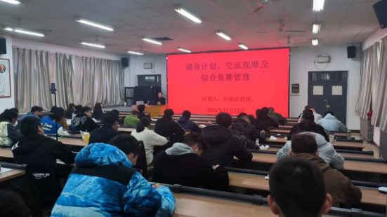 仵晓民详细讲授了综合竞赛的管理与组织,分别赛前、赛中、赛后给同学们做以细致阐述,并分享了自己多年来的工作经验,告诉同学们开展体育竞赛一定要具有可行性。
