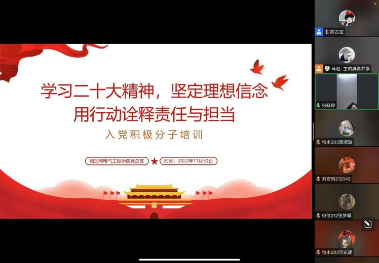 11月30日晚,物理与电气工程学院分党校举行第70期入党积极分子专题培训暨党的二十大精神宣讲报告会。党总支书记张晓玲、全体辅导员及58名入党积极分子参加了报告会,会议由党务秘书陈晨主持。