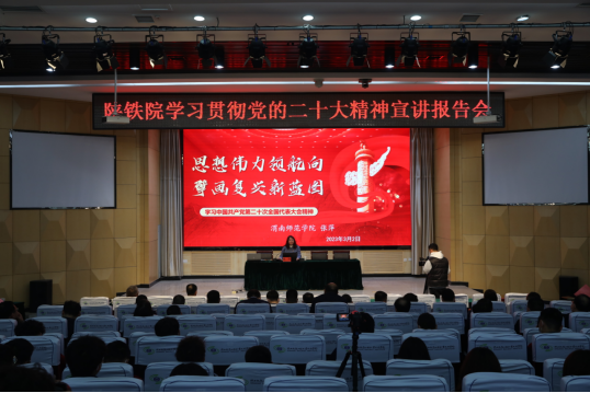 3月2日,中共渭南市委二十大精神宣讲团成员、马克思主义学院院长张萍教授应邀到陕西铁路工程职业技术学院宣讲二十大精神。该校各党总支(直属党支部)书记、各部门负责人、通讯员、新媒体负责人、二级网站负责老师及宣传栏负责人、马克思主义学院教师、辅导员及学生代表到场听讲。会议由陕西铁路工程职业技术学院党委副书记李林军主持。