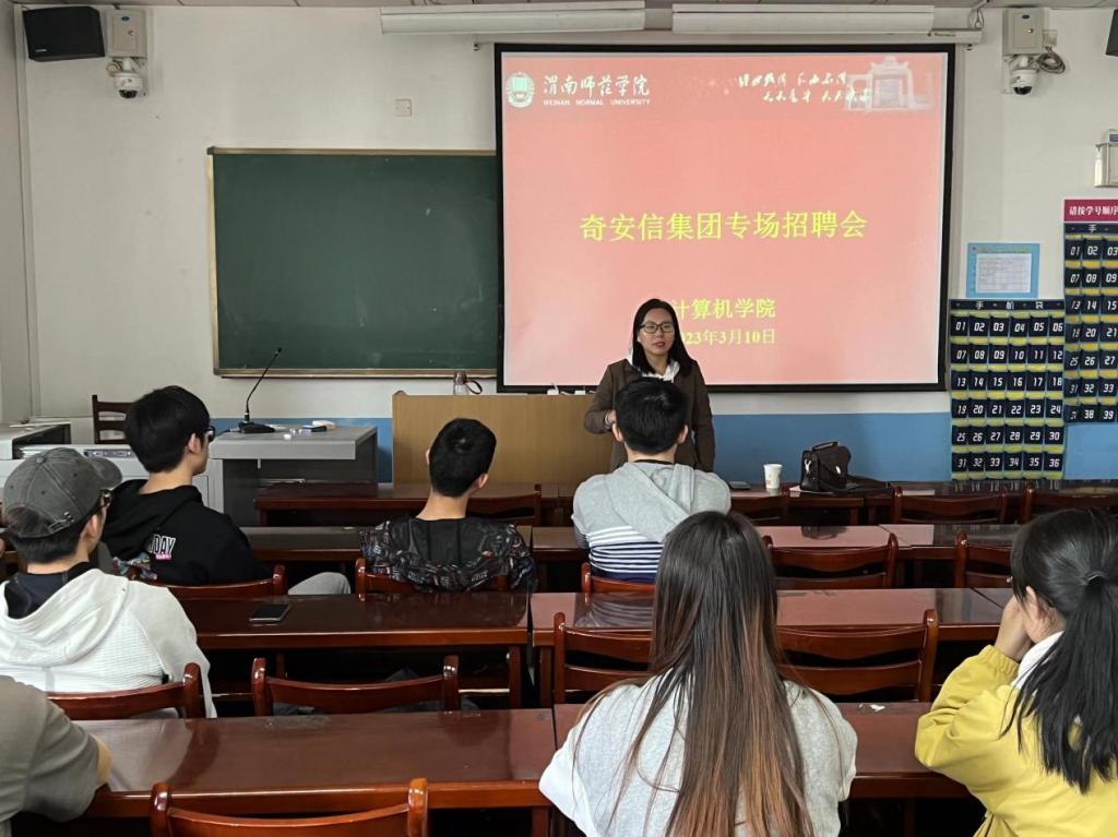 3月10日下午,计算机学院邀请奇安信集团在同心楼5206教室举行专场招聘宣讲会,学院近80名2023届毕业生参加招聘宣讲会。