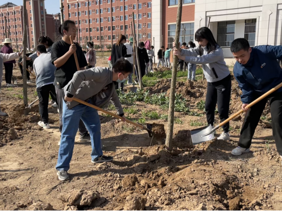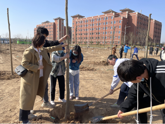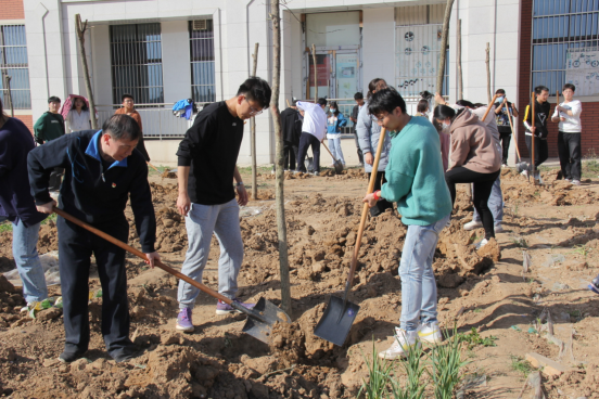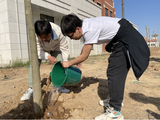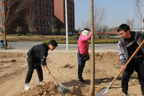 植树现场,大家按照既定分组,有序开展植树活动。师生们扶直树苗、挥锹铲土、培土围堰、提水浇灌……大家既分工明确,又通力合作,现场呈现出一片热火朝天的劳动场面。经过近两个小时的奋战,100株树苗笔直的挺立在植树现场。