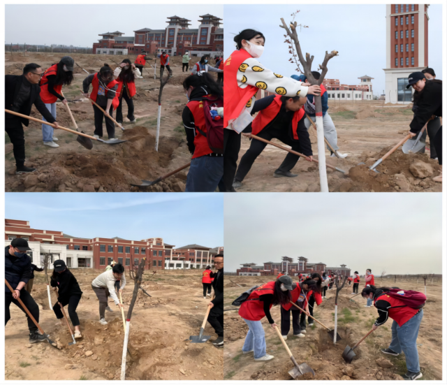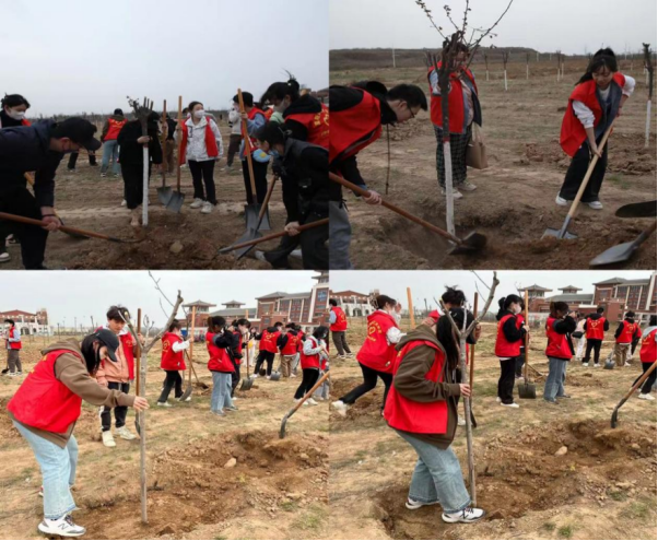 植树活动中,师生们纷纷拿起铁锹,互相协作,分工明确,兴高采烈的亲手栽下一棵棵树苗,扶树填土呈现出一派热火朝天的景象,“志愿红”正播种着绿色的希望,春日中勃勃的生机在赤红的照耀下熠熠生辉。本次活动共栽种树苗80余棵,为校园风光再添一道绿色风景线。