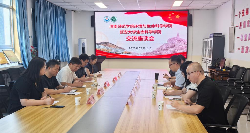 7月11日,环境与生命科学学院院长吴逸群率队赴延安大学生命科学学院开展交流座谈与校友回访活动。学院党总支副书记刘龙飞、教学副院长蒋缠文、学工办副主任王慧及辅导员代表郭毓昕。延安大学生命科学学院副院长邓健、科研管理办公室负责人姜文婷、研究生管理办公室负责人朱梦炎、教学工作办公室负责人冯辽辽、教师代表南国卫等参加座谈。