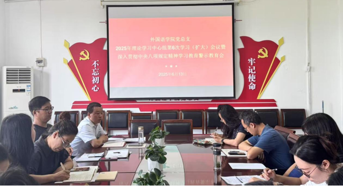 在学习教育开展过程中,外国语学院党总支构建起全方位、多层次的学习体系,确保学习教育走深走实,取得实绩。学习教育以来,党总支开设深入贯彻中央八项规定精神学习教育专题读书班1次、党总支理论学习中心组专题学习5次、党总支会议专题学习5次、师德师风专题学习会2次、警示教育3次、党总支下辖5个基层党支部完成学习教育全覆盖。党总支组织全院处科级干部、教工第三党支部全体党员参加学校党委副书记常青林《深化作风建设,弘扬清风正气,以中央八项规定精神推动学校高质量发展》专题党课1次。党支部组织“三会一课”专题学习5次,党总支书记、副书记、各支部书记完成“深入贯彻中央八项规定精神学习教育”专题党课,累计7次。此外,还通过主题党日活动、重温入党誓词等形式,强化党员身份意识和使命担当。