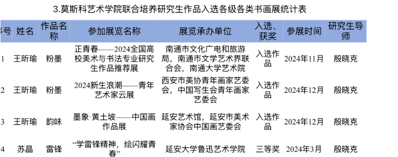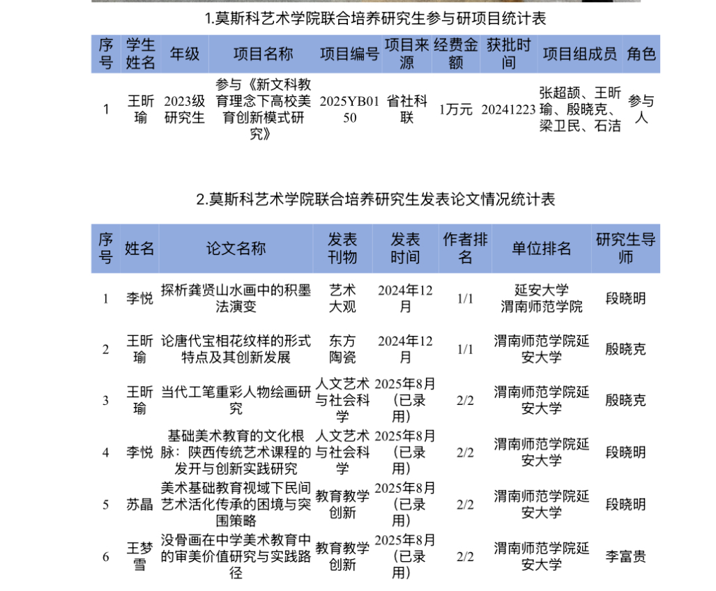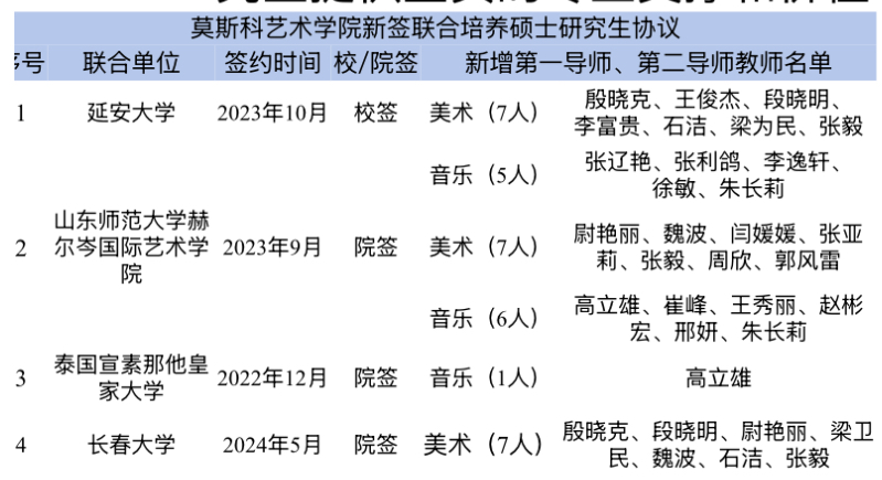 莫斯科艺术学院推动深入贯彻中央八项规定精神学习教育走深走实,聚焦“立德树人、务实合作”核心目标,以研究生联合培养为纽带,与延安大学、山东师范大学等5所高校构建跨区域育人共同体,现有7名美术学、美术与书法专业研究生在培。