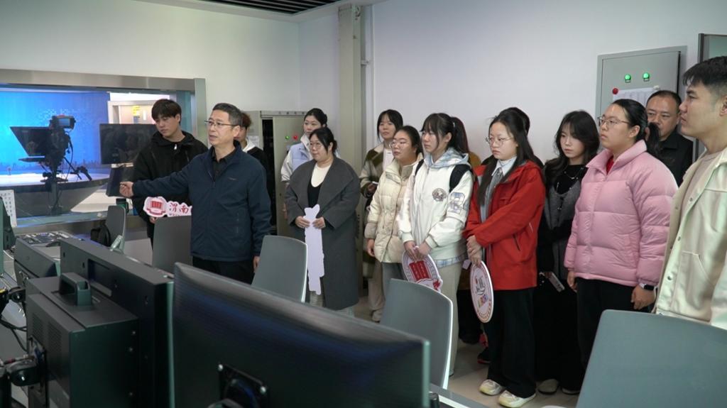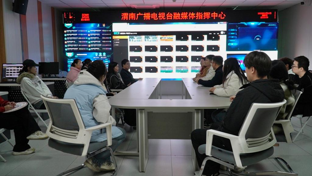 在渭南广播电视台相关技术人员的热情引导与认真讲解下,师生们先后走进新闻演播室、节目制作中心、非线性编辑机房等核心工作区域,亲身体验一线新闻媒体的工作环境与运作模式。
