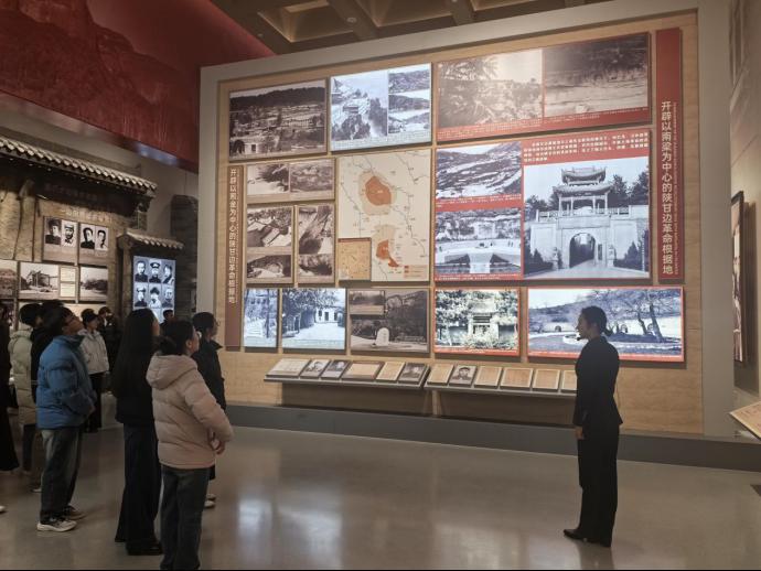随后,讲解员引导师生沿着“关中建党”“星火燎原”“铜墙铁壁”“秦川红日”四个板块深入学习。在参观过程中讲解员特别介绍了1947年西北野战军在彭德怀、习仲勋同志的指挥下实施的“三战三捷”系列战役。通过详实的图文资料和生动讲解,师生深入了解了青化砭、羊马河、蟠龙三场战役的详细经过及其重要意义。