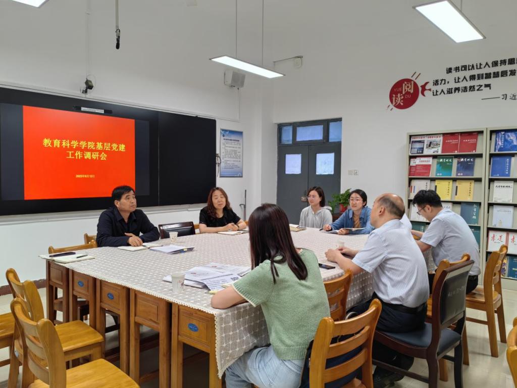 为推动学习贯彻习近平新时代中国特色社会主义思想主题教育走深走实,扎实推进基层党建工作高质量发展,6月12日,教育科学学院于知新楼召开了基层党建工作调研会,学校党委组织部部长田超一行,到教育科学学院调研基层党建工作。学院党总支书记李武军、院长李西彩和辅导员代表参加会议,会议由组织部部长田超主持。