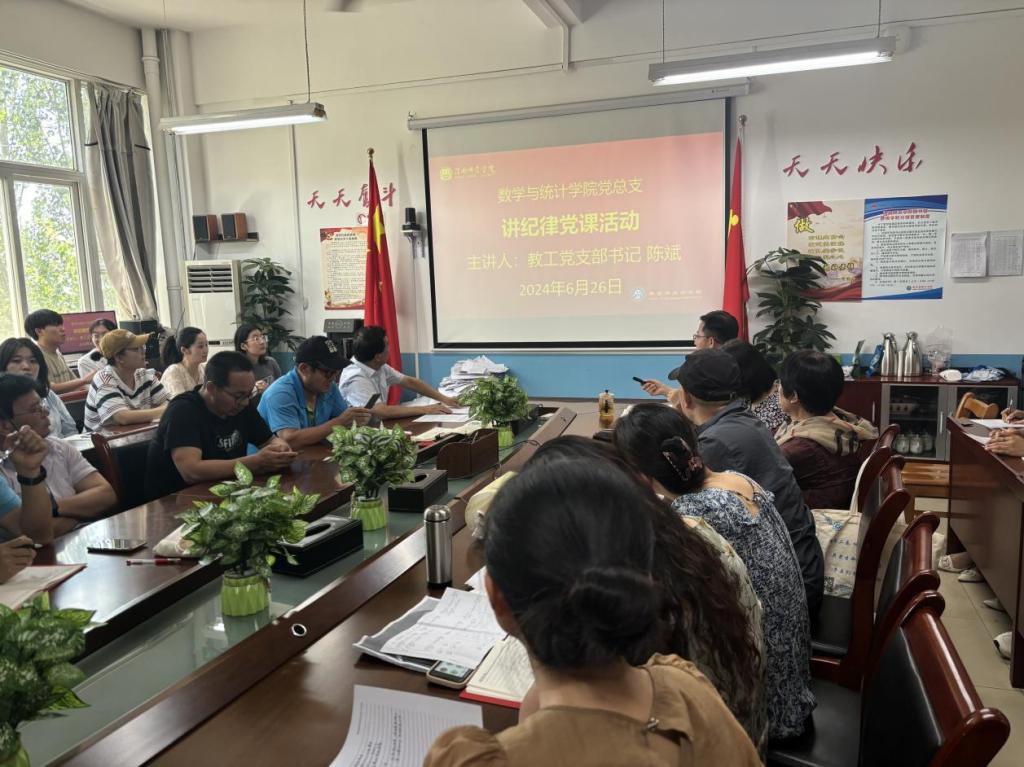 6月26日下午,数学与统计学院党总支于知新楼2318举办讲纪律党课活动,数学与统计学院党总支师生党员参加本次活动。