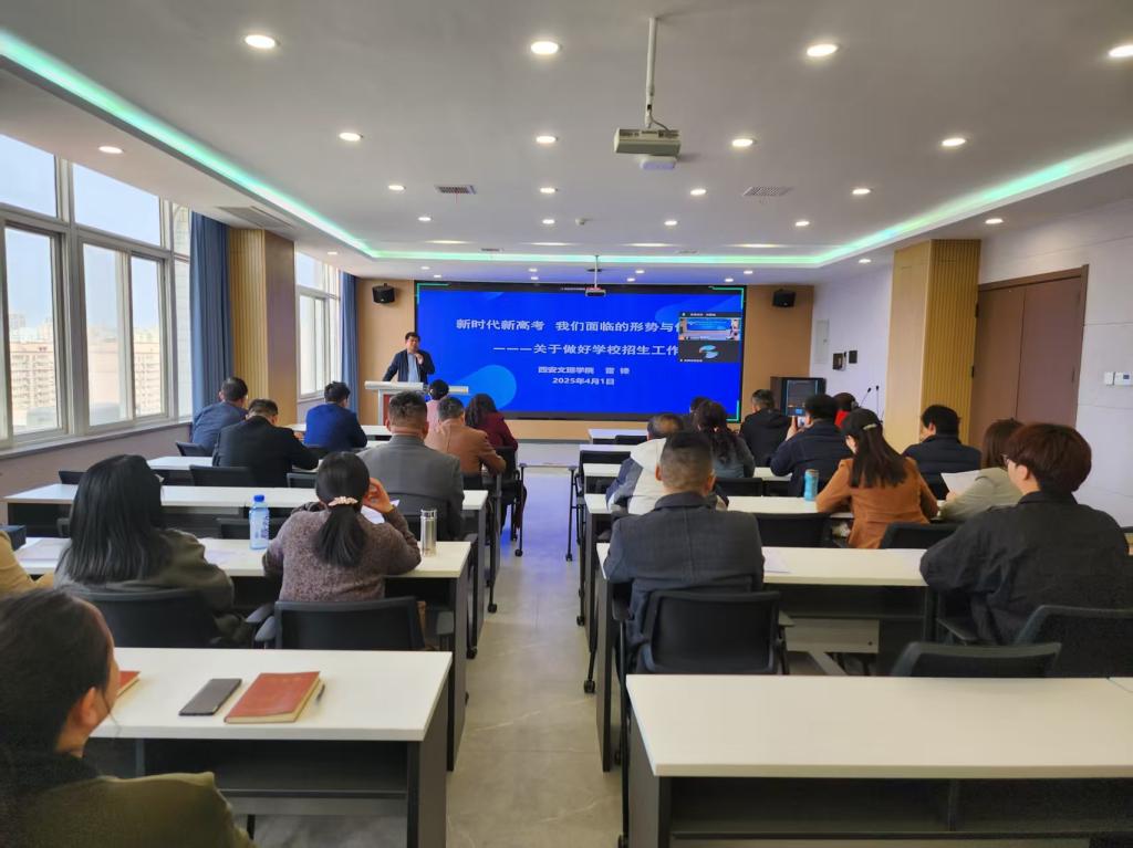 为助力我省2025年高考综合改革平稳落地,精准把握新高考招生政策动向,优化学校招生专业分组设置,高质量地做好2025年学校招生宣传工作,4月1日下午,学校招生办邀请西安文理学院招就处副处长雷锋,在厚德楼教师发展中心举办2025年陕西省新高考政策解读专题报告会。会议由教务处处长孙宏恩主持,各二级学院院长、专业负责人、部分教师、教务处招生办公室工作人员参加。