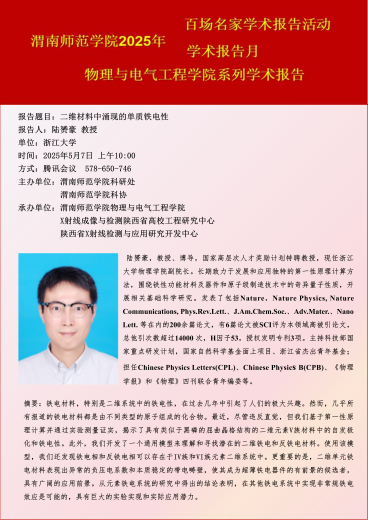 5月7日,在学校65周年校庆来临之际,伟德国际1949官网科研处、伟德国际1949官网科协联合伟德国际1949官网物理与电气工程学院、X射线成像与检测陕西省高校工程研究中心、陕西省X射线检测与应用研究开发中心举办百场名家学术报告活动。本次活动邀请浙江大学陆赟豪教授做学术交流。报告交流题目为:二维材料中涌现的单质铁电性。