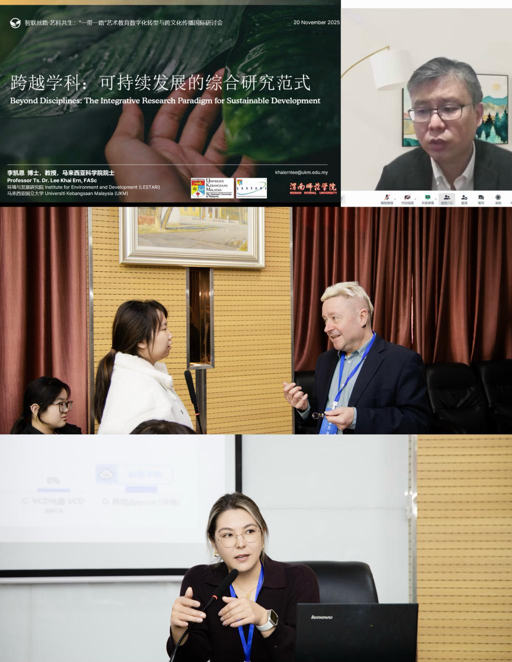 主题报告阶段,来自不同国家和文化背景的学者围绕数字技术赋能艺术教育、文化遗产保护与跨文化传播等议题展开了深入交流。马来西亚国民大学 Lee Khai Ern 教授以《跨越学科:可持续发展的整合型研究范式》系统阐释可持续发展理念的核心议题与全球脉络,强调跨学科与超学科方法在复杂情境中的必要性。德国专家 HARTMANN DIRK WERNER(张克)围绕《人工智能和元宇宙在艺术保护、旅游和文化交流中的应用》介绍了数字化技术在文物呈现、虚拟旅游与文化传播中的实践价值。吉尔吉斯斯坦学者 Mambetova Elnura(叶丽娅)通过《中国电影在吉尔吉斯斯坦》的案例分析了中国电影在当地的传播效应及其在促进两国文化交流中的作用。