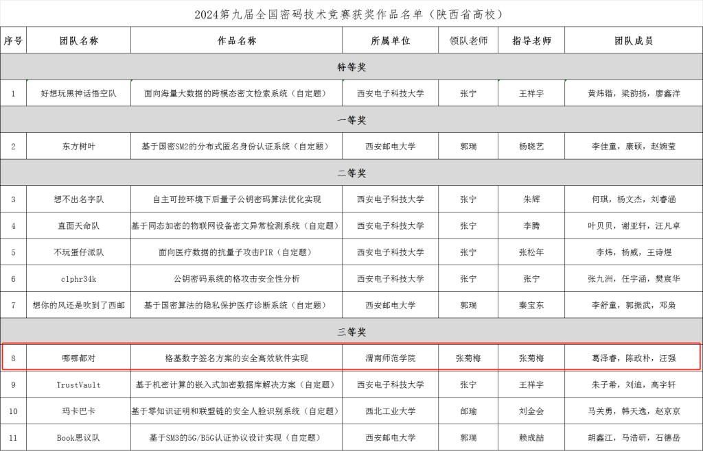 全国密码技术竞赛是国内级别最高、影响力最大的密码学赛事,旨在“提高密码意识、普及密码知识、实践密码技术、发现密码人才”。本次大赛中,陕西省共有四所高校的22支队伍获奖,其中伟德官网作为唯一一所地方师范院校,能够在众多高水平参赛队伍中脱颖而出,充分体现了学校在密码技术领域的教学与科研潜力。