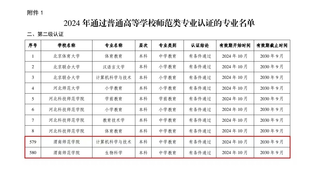 近日,教育部办公厅公布2024年通过普通高等学校师范类专业认证及认证中期审核专业名单。伟德官网计算机科学与技术、生物科学2个师范专业顺利通过中学教育二级认证,认证结论为“有条件通过”,有效期为六年(自2024年10月开始,截止2030年9月)。