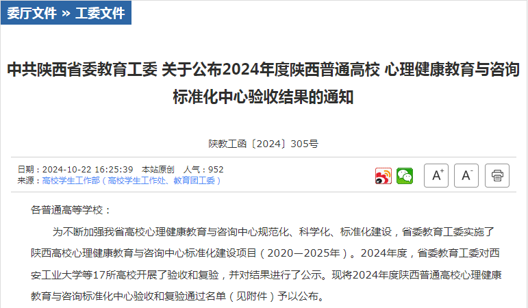 10月22日,中共陕西省委教育工委发表《关于公布2024年度陕西普通高校 心理健康教育与咨询标准化中心验收结果的通知》,伟德官网顺利通过2024年度陕西普通高校心理健康教育与咨询标准化A类中心验收。