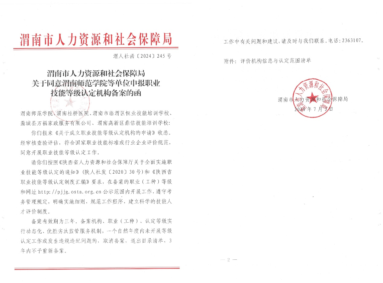 7月10日,伟德官网收到渭南市人力资源和社会保障局发布的《关于同意伟德国际1949官网等单位申报职业技能等级认定机构备案的函》(渭人社函[2024] 245号),正式获得面向社会开展职业技能等级认定工作的资质。此次伟德官网获得行政办事员、电子商务师、计算机程序设计员、物业管理师、劳动关系协调员、企业人力资源管理师、装饰美工、公共营养师共8个职业(包含初级、中级、高级、技师、高级技师五个等级)工作技能等级的认定资质,可以面向社会开展职业技能等级认证工作,有效期为3年。