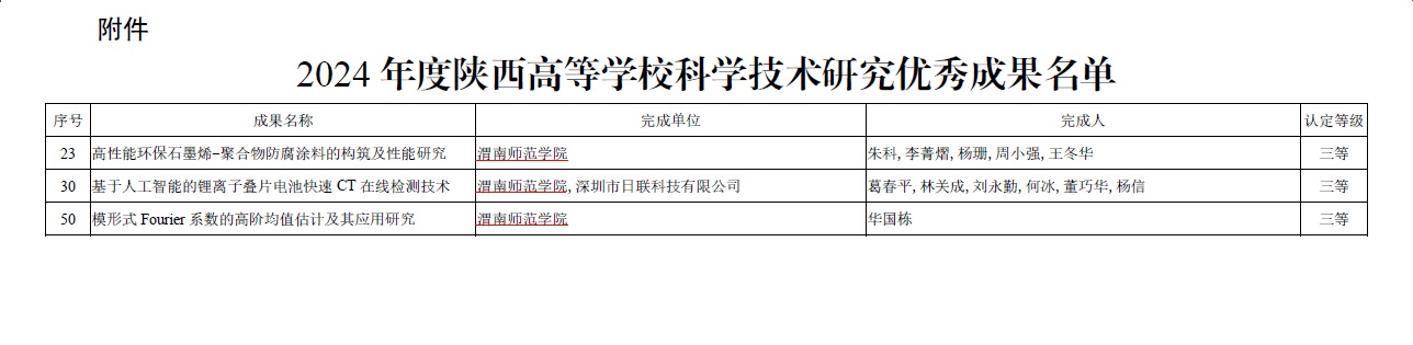 近日,陕西省教育厅公布了2024年度陕西高等学校科学技术研究优秀成果名单。伟德官网《高性能环保石墨烯-聚合物防腐涂料的构筑及性能研究》《基于人工智能的锂离子叠片电池快速CT在线检测技术》《模形式Fourier系数的高阶均值估计及其应用研究》三项成果获得三等奖。