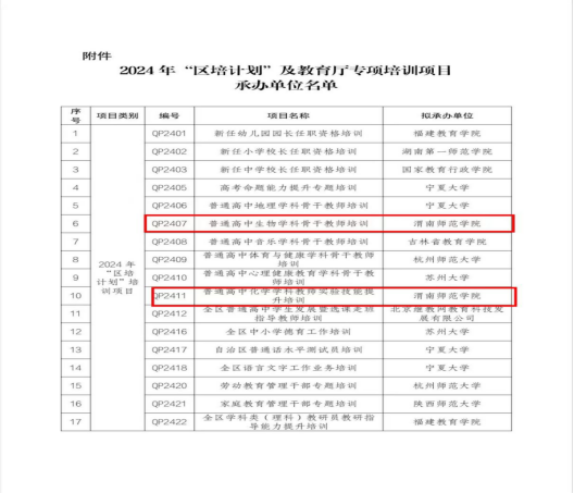 近日,宁夏回族自治区教育厅公布了2024年度“区培计划”及教育厅专项培训项目承办单位名单。伟德官网获批2项“区培计划”项目,分别为《普通高中生物学科骨干教师培训》和《普通高中化学学科教师实验技能提升培训》。这是伟德官网继去年获批自治区基础教育教师培训基地后再次承担培训项目。