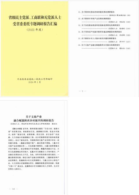 日前,为贯彻落实习近平总书记关于做好新时代党的统一战线工作的重要思想,充分发挥无党派人士、党外知识分子的智力优势,助力奋进中国式现代化新征程、谱写陕西高质量发展新篇章,党委统战部深入开展统一战线“凝心铸魂强根基 团结奋进新征程”主题教育,积极组织伟德官网无党派人士、党外知识分子申报2023年度理论问题研究和重点调研课题,伟德官网共有6人参加省委统战部的重点调研课题并提交了调研报告,其中,无党派人士、马克思主义学院副教授梁红仙《关于文旅产业融合赋能陕西乡村振兴的调研报告》入选了陕西省委统战部编印的《省级民主党派、工商联和无党派人士受省委委托专题调研报告汇编(2023年度)》,省委书记赵一德亲笔批示“这些报告是下了功夫的。各相关部门要认真参研。”