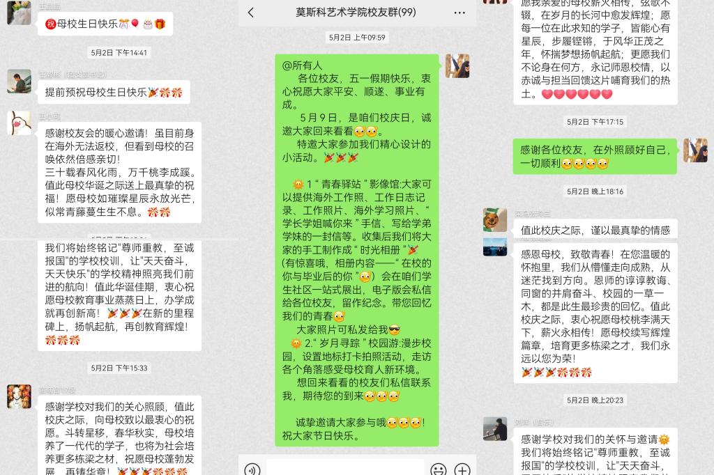 5月8日,伟德国际1949官网建校65周年校庆日,莫斯科艺术学院海内外校友通过视频祝福、信件、云端连线等形式参与校庆,跨越地域传递对母校的深情,彰显校友群体凝聚力。